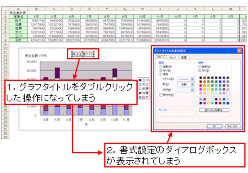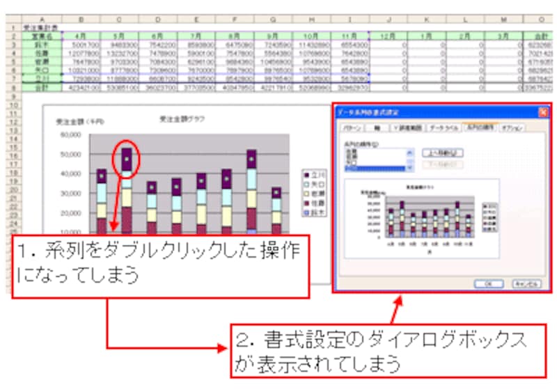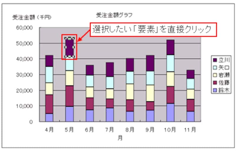 この選択操作を、グラフツールバーを使わないで行う場合、まず、系列をクリックし、「一息ついてから」要素をクリックします。一息つかないでクリックすると、系列をダブルクリックした操作になってしまい、書式設定のダイアログボックスが表示されてしまうので注意が必要です。