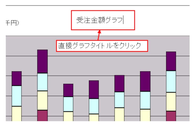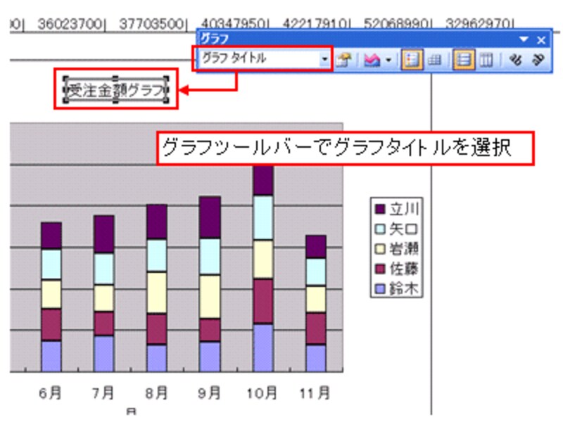 グラフタイトルや項目軸ラベルなど、部品の内容を変更する場合、グラフツールバーで部品を選択した後、直接クリックして、その内容を変更します。