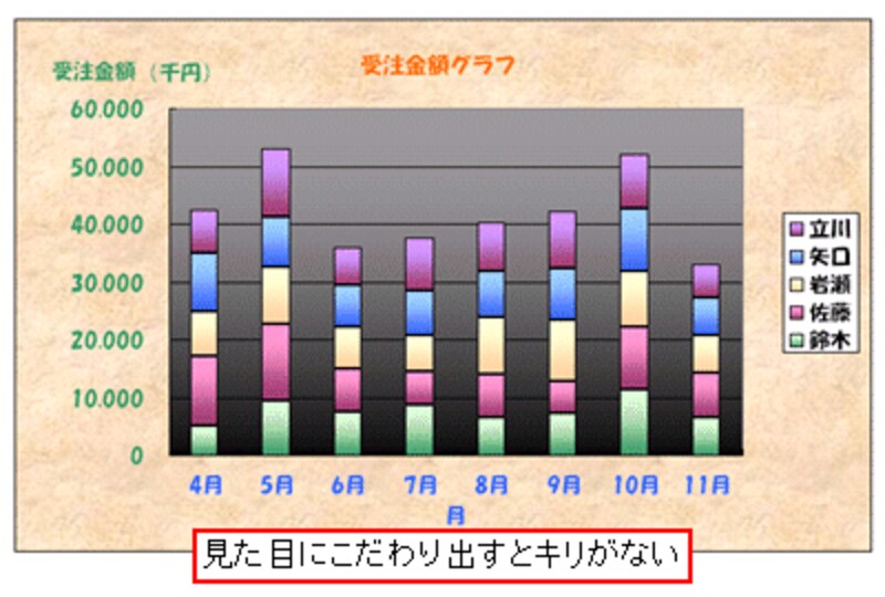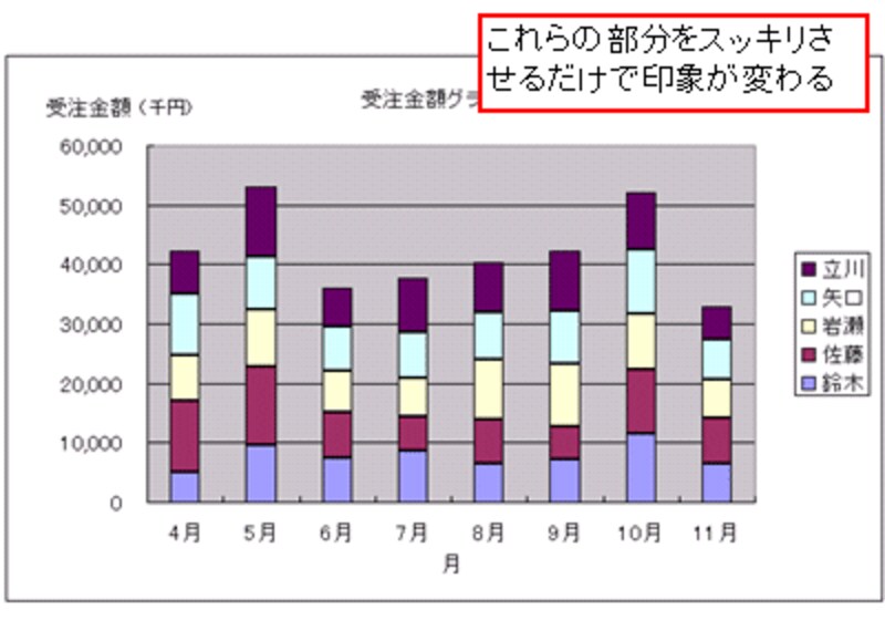 グラフウィザードで作成されたグラフをパッと見て感じるのは、「項目軸」と「数値軸」のバランスが悪いことです。これらの部分をスッキリさせるだけでも、随分と印象が変わります。![]() |