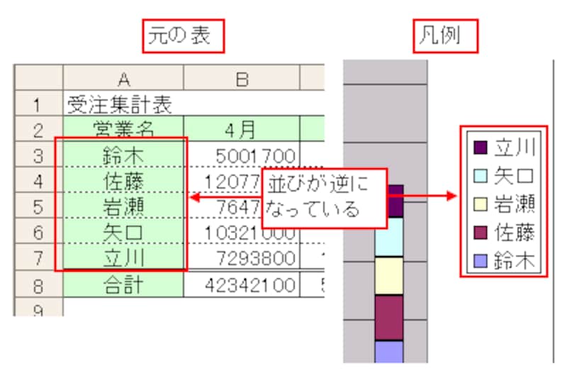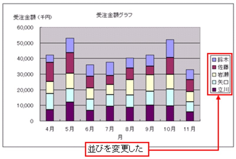 また、各グラフの種類によって、変更すべきポイントがあります。今回の積み上げ棒グラフの場合、「系列」の並びが逆になっている点が気になります。これも書式の設定で変更できます。