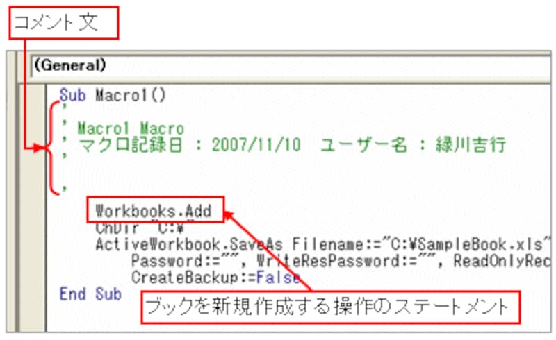 マクロ名、マクロ記録日、ユーザー名が記述されているコメント文に続いて、作成されたマクロが表示されています。1行目をご覧下さい。「Workbooks.Add」と記述されていますね。これが、ブックを新規作成する操作のステートメントです。メソッドの基本構文の形をしていますね。