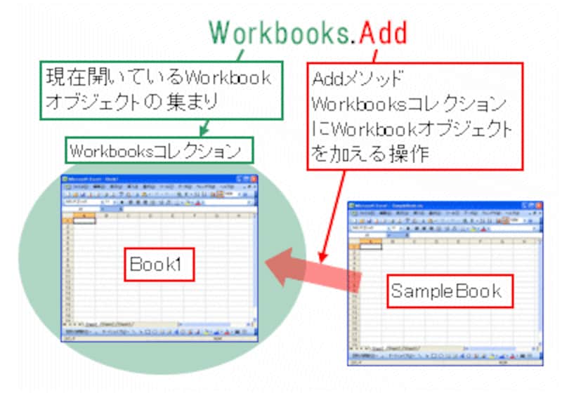 「Workbooks」は、複数のWorkbookオブジェクトを表す、Workbooksコレクションを表しますが、厳密にいうと、「現在開いているWorkbookオブジェクトの集まり」を表しています。そして、「Add」メソッドは、この集まりにWorkbookオブジェクトを「加える」操作、つまり「新しいWorkbookオブジェクトを作成する」操作を実行します。
