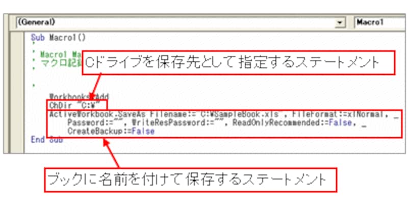「名前を付けて保存」ダイアログボックスが表示されてから、Cドライブを保存先として指定しましたが、その操作が「ChDir」ステートメントとして記述されています。そして、付けたい名前を入力して「保存」ボタンをクリックしたときに記述されたのが、その次の行の「SaveAs」メソッドによるステートメントです。このステートメントは、引数を持つメソッドの構文ですね。![]() |