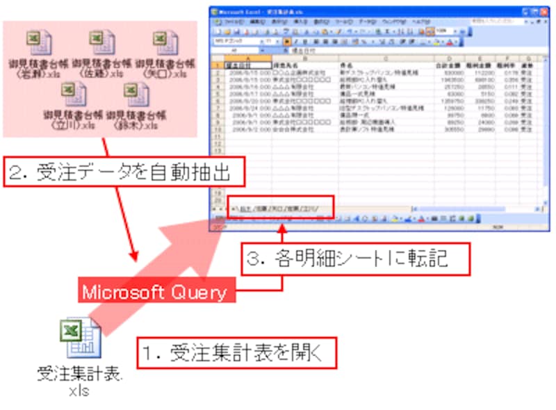 各営業担当の受注データを明細シートに転記するには、「Microsoft Query」という付属ツールを利用します。このツールを利用すると、受注集計表を開いたときに、各営業の御見積書台帳から受注データを自動抽出して明細シートに転記し、常に新しい情報を表示させることができます。