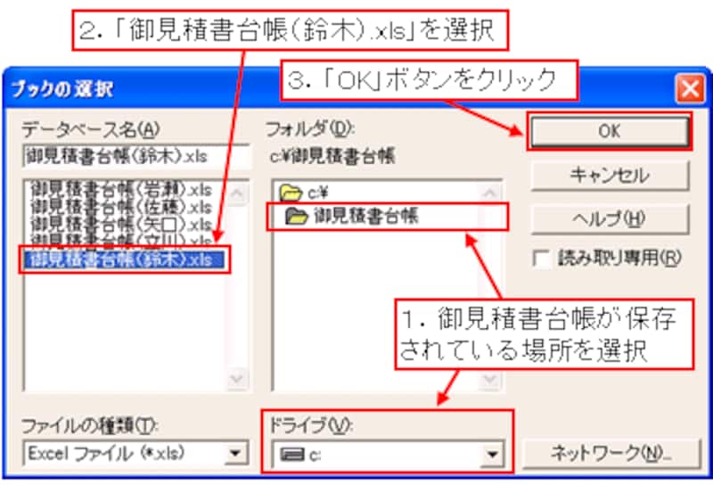 表示された「ブックの選択」ダイアログボックスの「ドライブ」や「フォルダ」の一覧から、鈴木さんの御見積書台帳が保存されている場所を選択します。左側の「データベース名」の一覧に表示された「御見積書台帳(鈴木).xls」を選択して「OK」ボタンをクリックします。