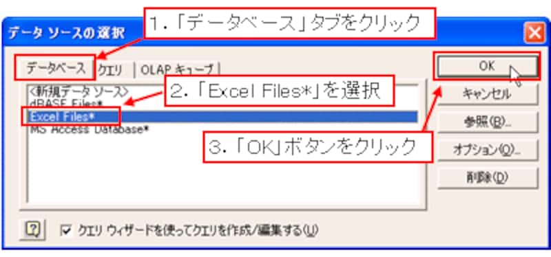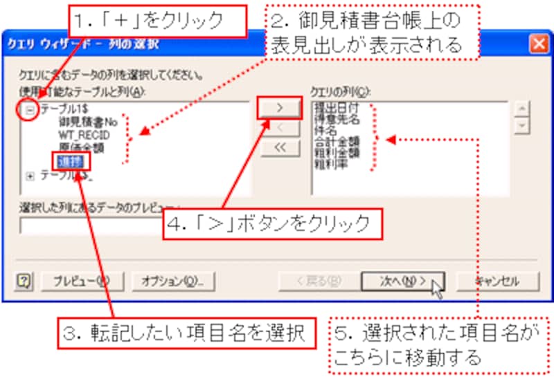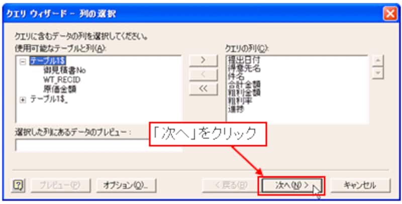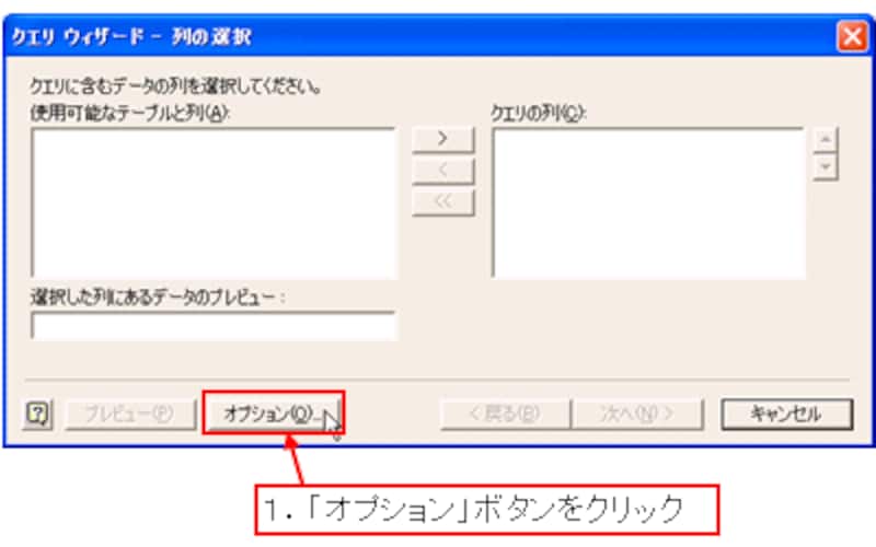 表示された「クエリ ウィザード?列の選択」ダイアログボックスで「オプション」ボタンをクリックします。