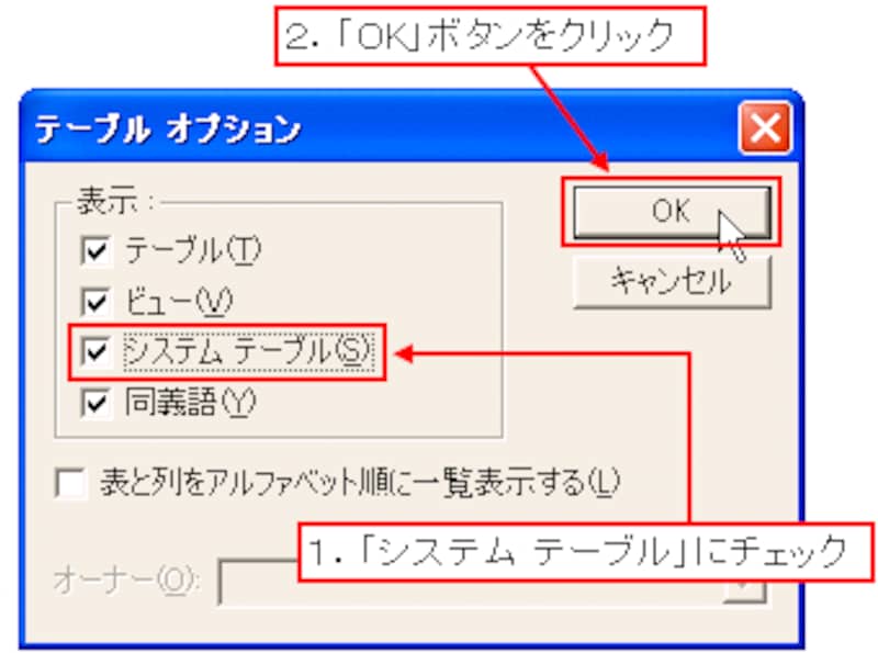 表示された「テーブル オプション」ダイアログボックスの「表示」の一覧で「システム テーブル」にチェックを入れて「OK」ボタンをクリックします。