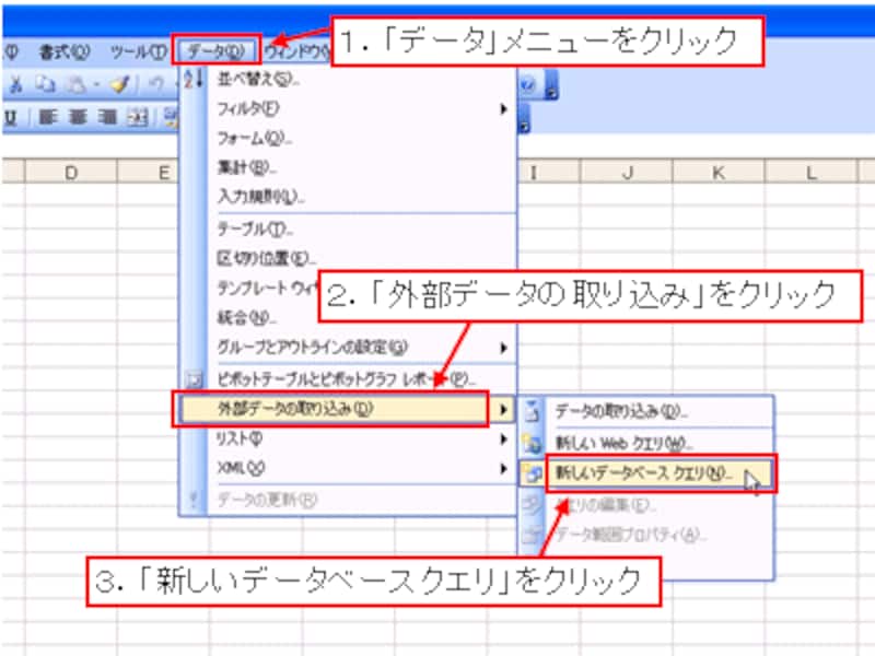 「データ」メニュー→「外部データの取り込み」→「新しいデータベースクエリ」をクリックします。