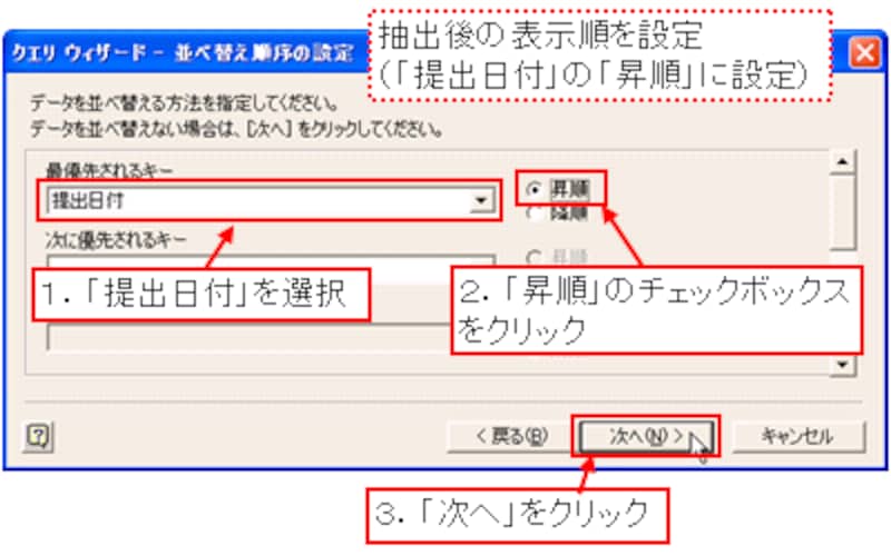 表示された「クエリ ウィザード?並べ替え順序の設定」ダイアログボックスで、抽出後の表示順を設定します。ここでは「提出日付」の「昇順」に設定します。「最優先されるキー」のドロップダウンリストから「提出日付」を選択し、右側の「昇順」のチェックボックスをクリックします。設定できたら「次へ」をクリックします。