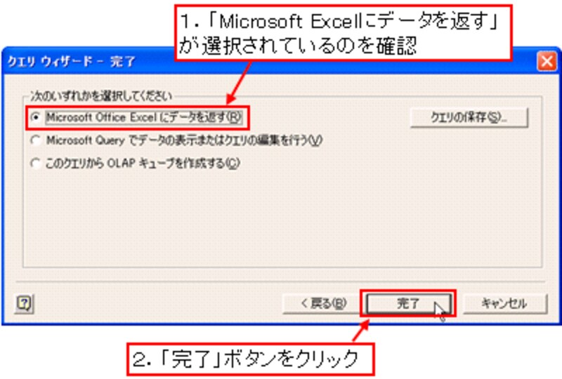表示された「クエリ ウィザード?完了」ダイアログボックスで、「Microsoft Excelにデータを返す」が選択されているのを確認して「完了」ボタンをクリックします。