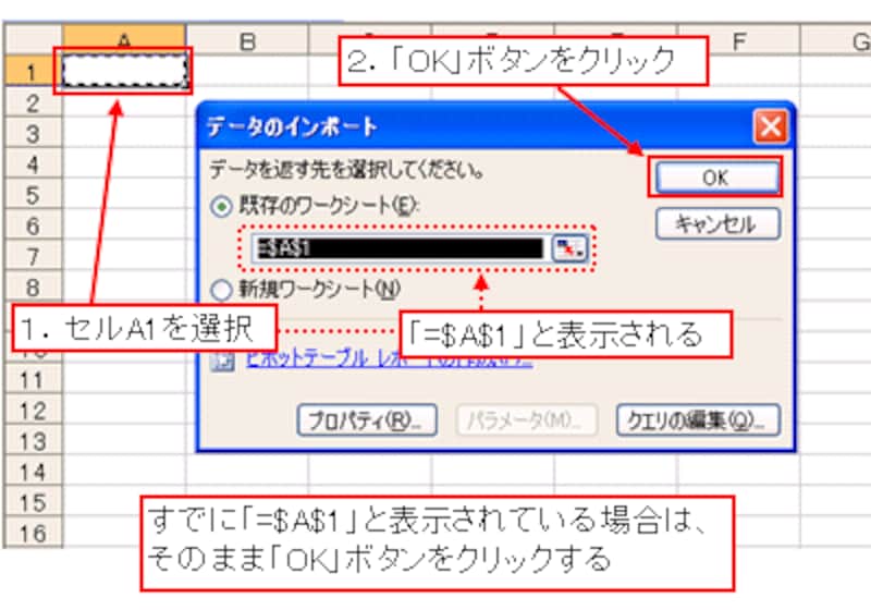 続いて、「データのインポート」ダイアログボックスが表示されます。ここで、抽出されたデータを表示させる左上端のセルを指定します。ここでは、セルA1を選択します。設定できたら「OK」ボタンをクリックします。