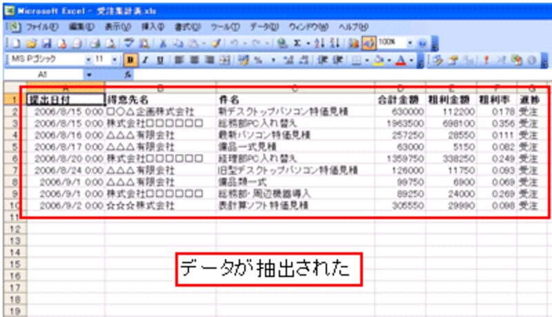 シート上に、「進捗」が「受注」となっているデータが抽出されました。