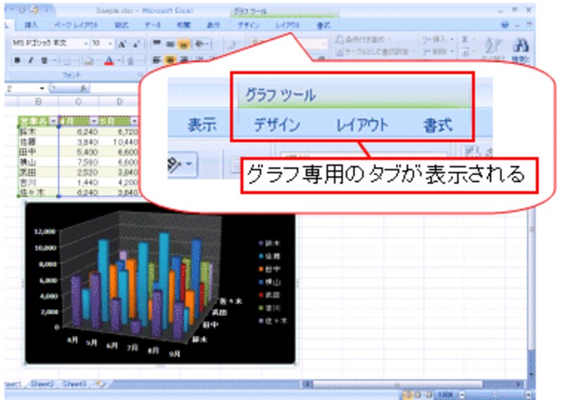 それでは、作成したグラフを選択してみましょう。すると、グラフ専用のタブが表示されます。
