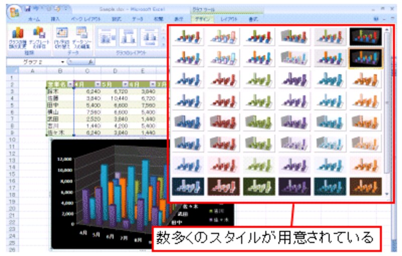 「デザイン」タブでは、グラフの種類を変更したり、グラフ全体のレイアウトを変更したりできます。「グラフのスタイル」には、テーブルのスタイルと同様に、あらかじめ数多くのスタイルが用意されていて、ワンクリックでスタイルを変更できます。