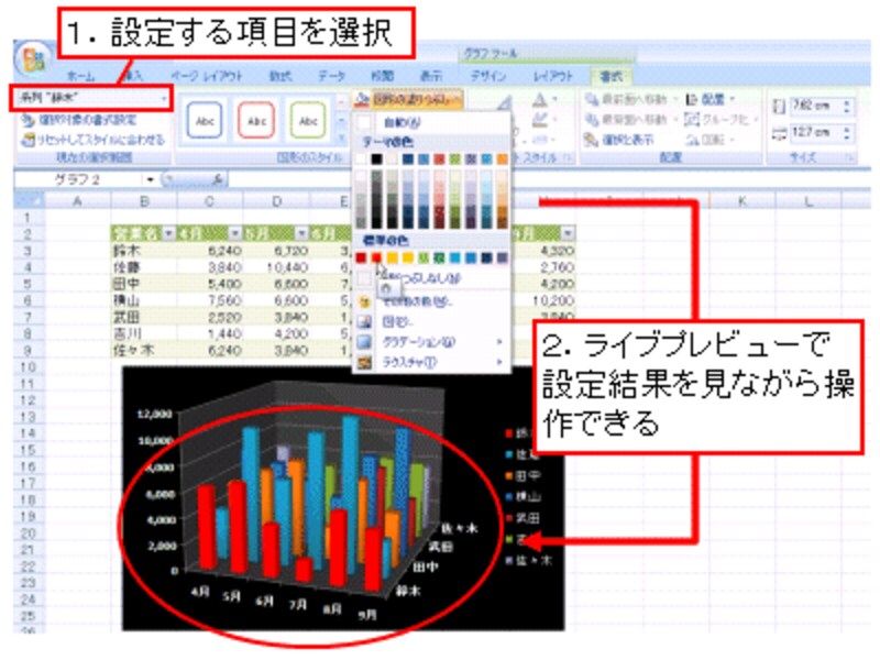 ※今のところ、グラフのスタイルでライブプレビューは機能しないようです。