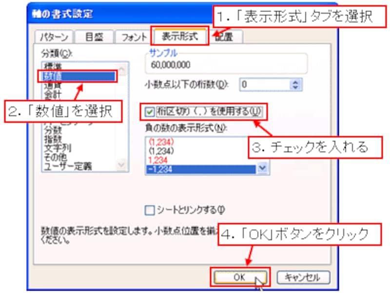 「表示形式」タブを選択して、「分類」から「数値」を選択し、「桁区切り(,)を使用する」にチェックを入れて「OK」ボタンをクリックします。