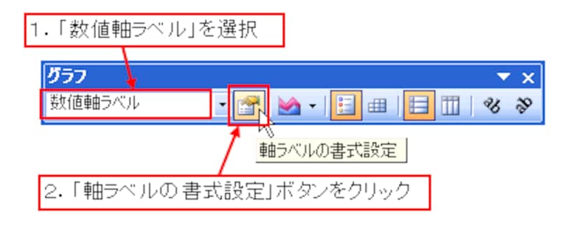 グラフツールバーの「グラフオブジェクト」の一覧から「数値軸ラベル」を選択し、「軸ラベルの書式設定」ボタンをクリックします。