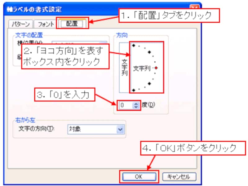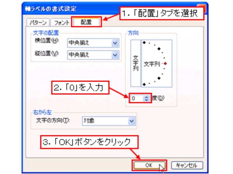 表示された「軸ラベルの書式設定」ダイアログボックスで「配置」タブを選択し、「方向」に「0」を入力して「OK」ボタンをクリックします。