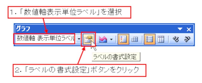 グラフツールバーの「グラフオブジェクト」の一覧から「数値軸表示単位ラベル」を選択して、「ラベルの書式設定」ボタンをクリックします。