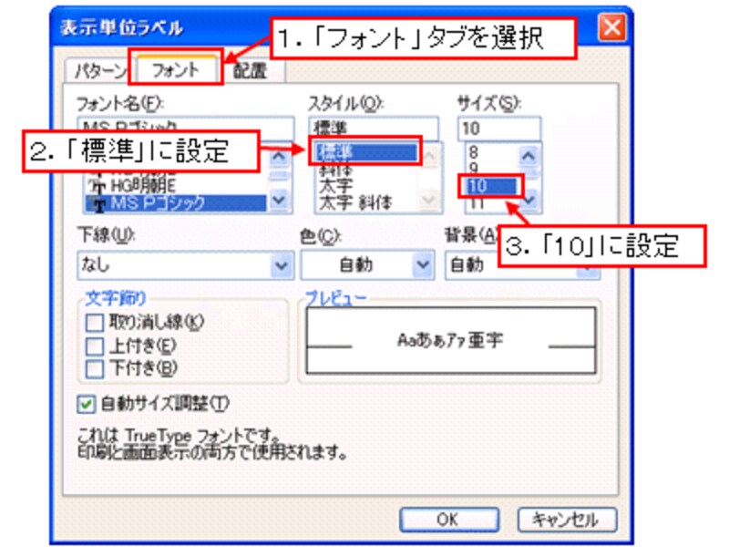 表示された「表示単位ラベル」ダイアログボックスで「フォント」タブを選択し、「スタイル」を「標準」、サイズを「10」に設定します。