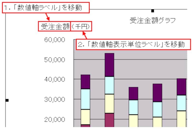 「数値軸ラベル」と「数値軸表示単位ラベル」を数値軸の上へドラッグして、表示位置を移動します。