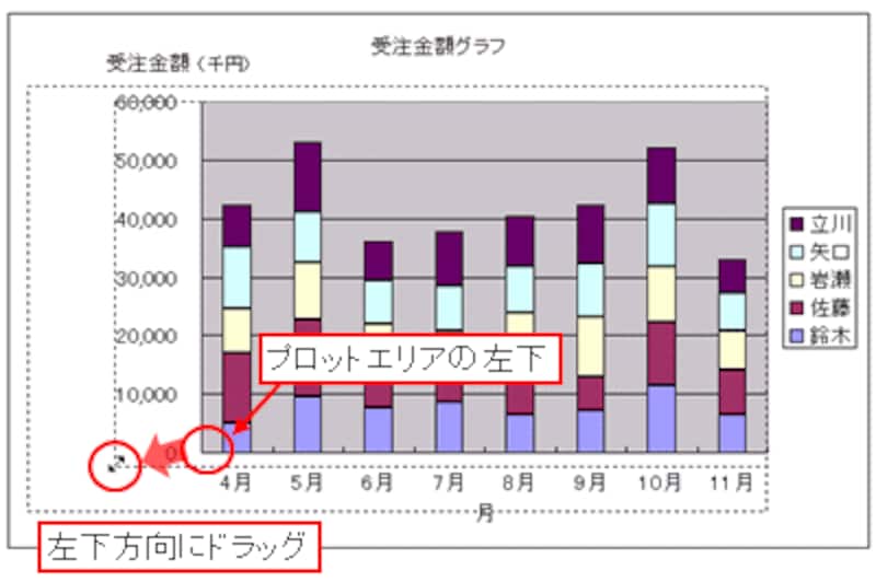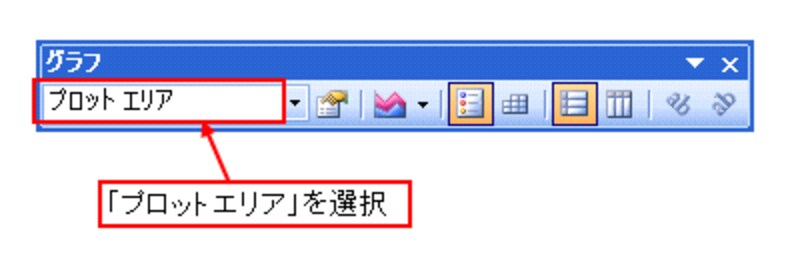 左下方向に余白ができたので、グラフのプロットエリアを広げて、バランスの良い大きさに変更します。グラフツールバーの「グラフオブジェクト」の一覧から「プロットエリア」を選択します。