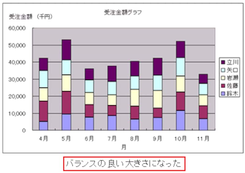 受注合計額グラフの数値軸では、表示されている数値の桁が多いために読みづらく、数値軸ラベルが、数値軸の左側に、読みづらいタテ方向で配置されています。そこで、数値の桁を「千円」単位に変更し、数値軸ラベルを読みやすいヨコ方向に変更して、数値軸の上に配置します。