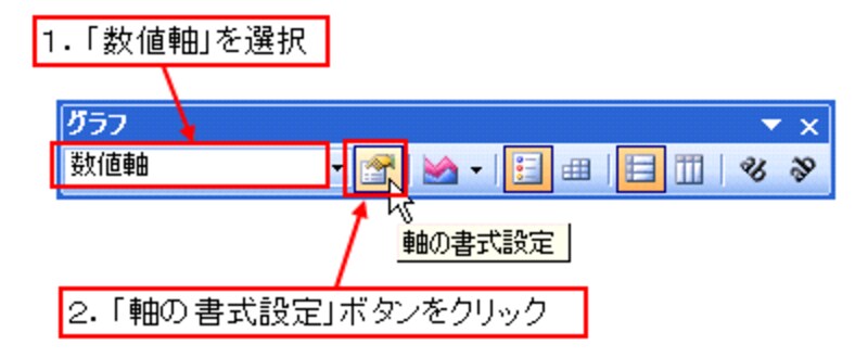 グラフツールバーの「グラフオブジェクト」の一覧から「数値軸」を選択して、「軸の書式設定」ボタンをクリックします。
