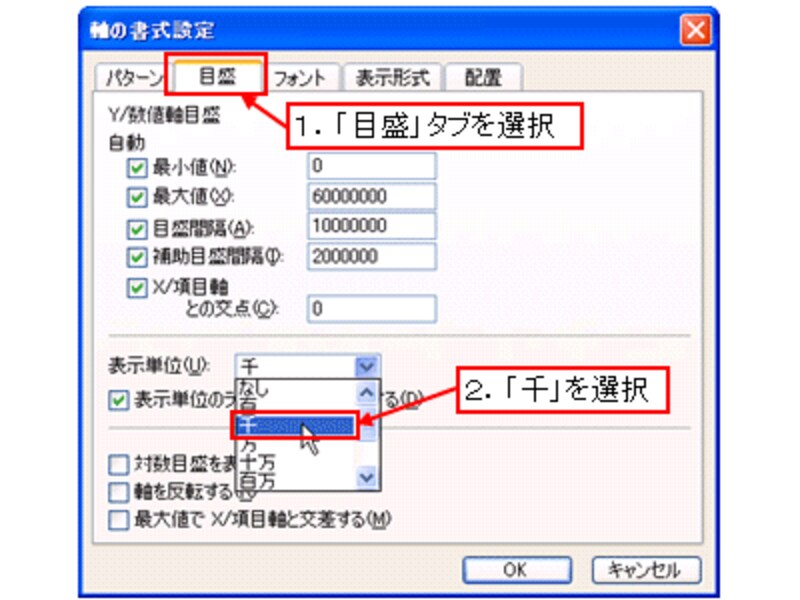 表示された「軸の書式設定」ダイアログボックスで「目盛」タブを選択し、「表示単位」の一覧から「千」を選択します。