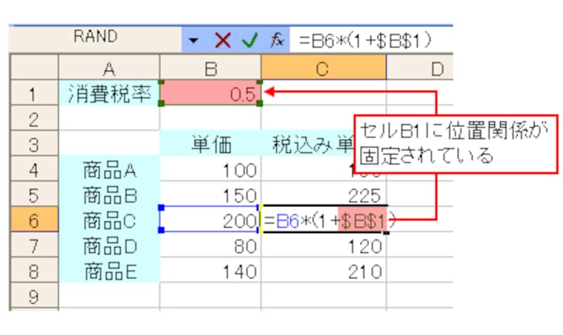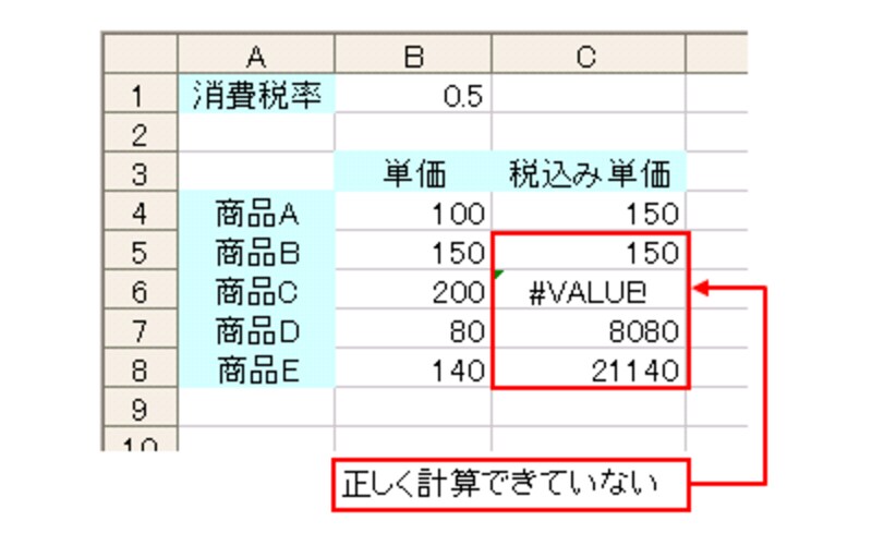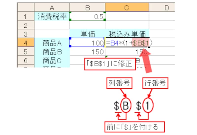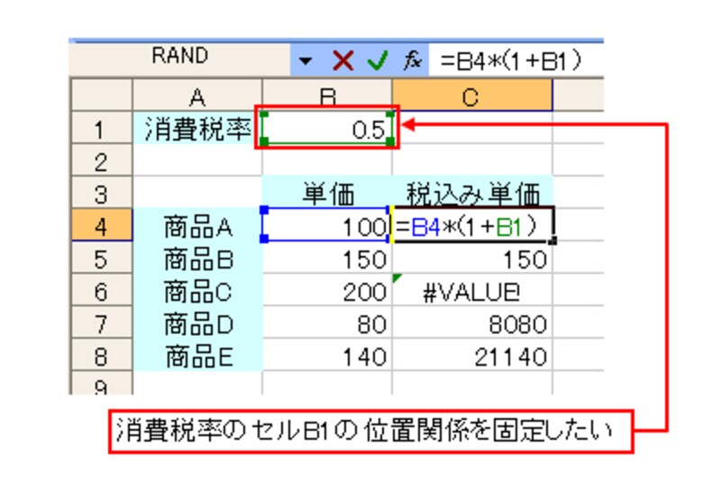 正しく計算結果を求めるには、計算式を入力するセルの行が変わっても、消費税率のセルB1の位置関係を固定する必要があります。