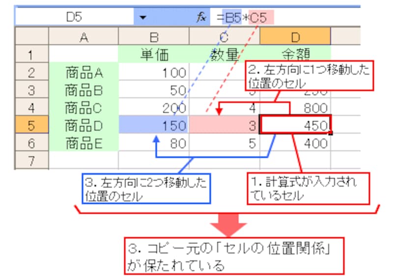 すると、例えばセルD5には、数式「=B5*C5」が入力されます。そして、「計算式が入力されているセル」から見て「左方向に1つ移動した位置のセル」と「左方向に2つ移動した位置のセル」のデータを使って計算する、といったコピー元の「セルの位置関係」が保たれています。