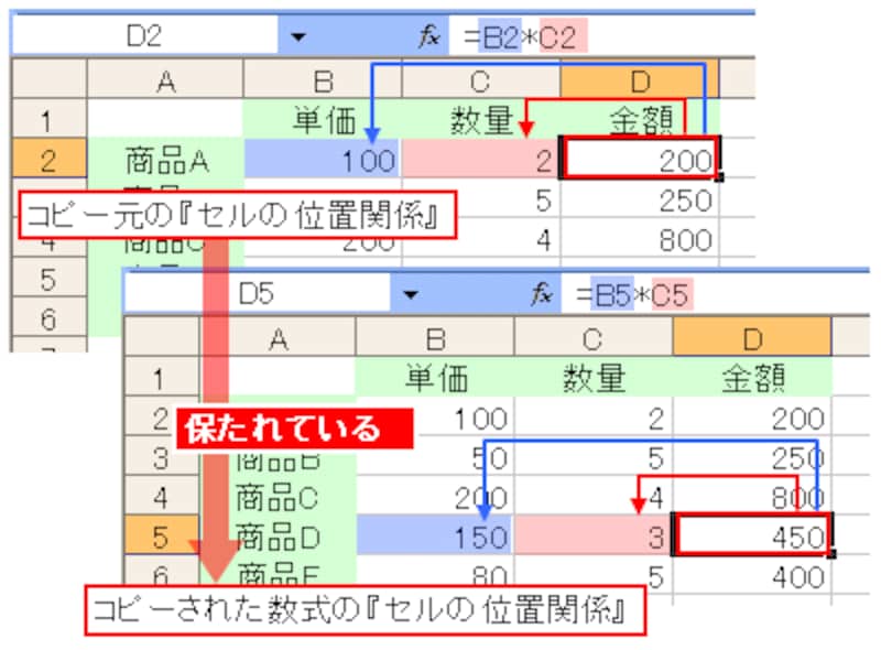 これが関数の「相対参照」です。つまり、相対参照では、「コピーされた数式で、コピー元の『セルの位置関係』が保たれる」ということです。通常、数式をコピーすると、この相対参照で関数がコピーされます。