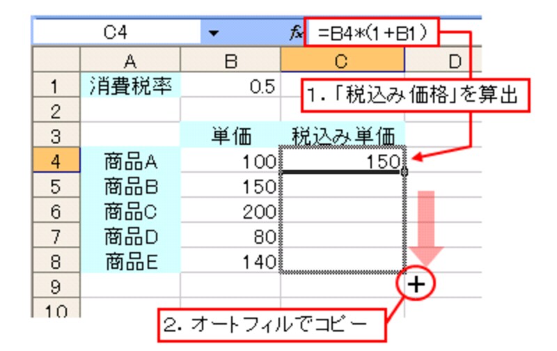続いて「絶対参照」について見ていきましょう。まずは、サンプルをご覧下さい。商品の「単価」の「税込み価格」を算出しています。この数式を、セルC5からセルC8までオートフィルでコピーします。