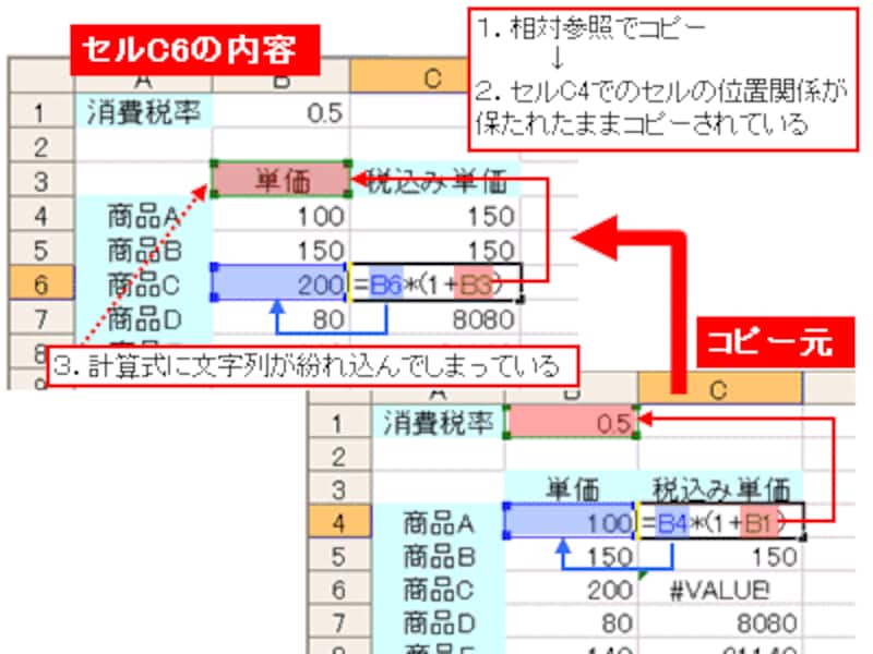いかがでしょうか。関数は相対参照でコピーされているため、コピー元であるセルC4でのセルの位置関係が保たれたままコピーされています。そのため、セルC6では、計算式に文字列が紛れ込んでしまっているのでエラーが発生しています。