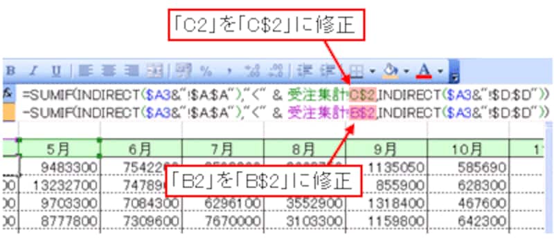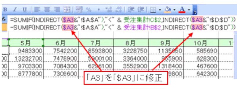 「エクセルで自動集計(SUMIF関数の活用)」の「SUMIF関数による数式の作成(後半)」で、作成した数式をINDIRECT関数を使って修正し、セルの記述を6カ所修正しました。実は、これらの修正のうち、INDIRECT関数の引数の記述で「絶対参照」を、セル記述の修正で「複合参照」を利用していました。■INDIRECT関数の引数の記述