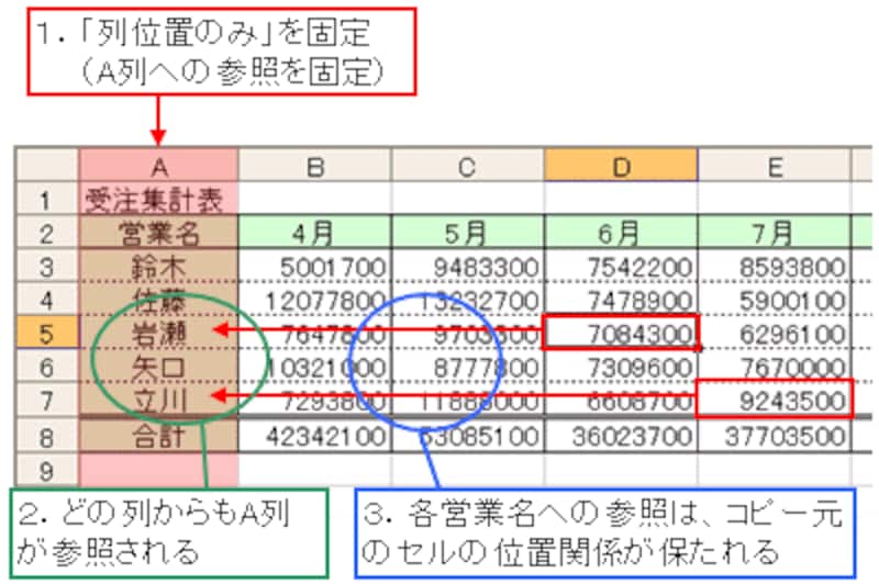 これは、「営業名」が入力されているセル範囲の「列位置のみ」を固定する複合参照です。これで、オートフィルで関数をコピーしたときに、営業名が入力されているA列への参照が固定されます。また、行ごとの各営業名への参照は、5行目なら「岩瀬」、7行目なら「立川」といったように、コピー元のセルの位置関係が保たれています。