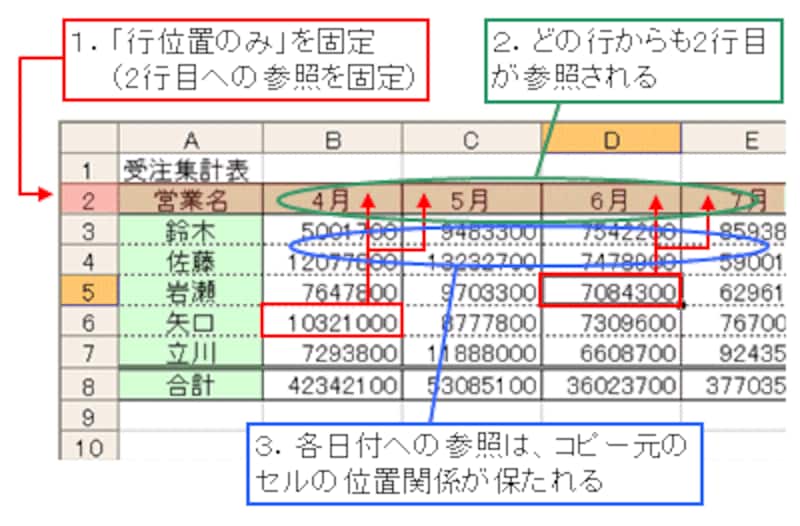 これは、日付が入力されている見出しの「行位置のみ」を固定する複合参照です。これで、オートフィルで関数をコピーしたときに、日付が入力されている2行目への参照が固定されます。各列の日付への参照は、B列なら「B列とC列」、D列なら「D列とE列」といったように、コピー元のセルの位置関係が保たれています。