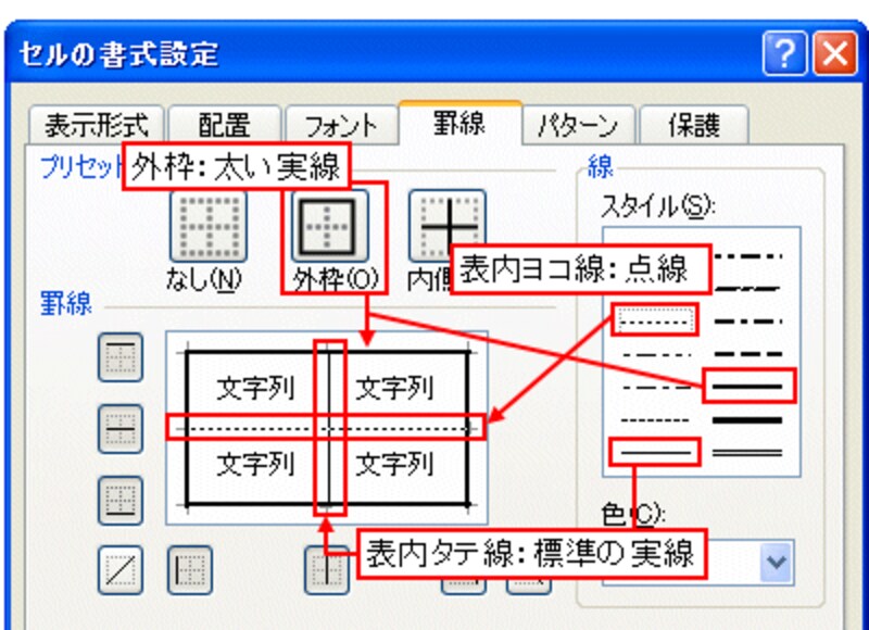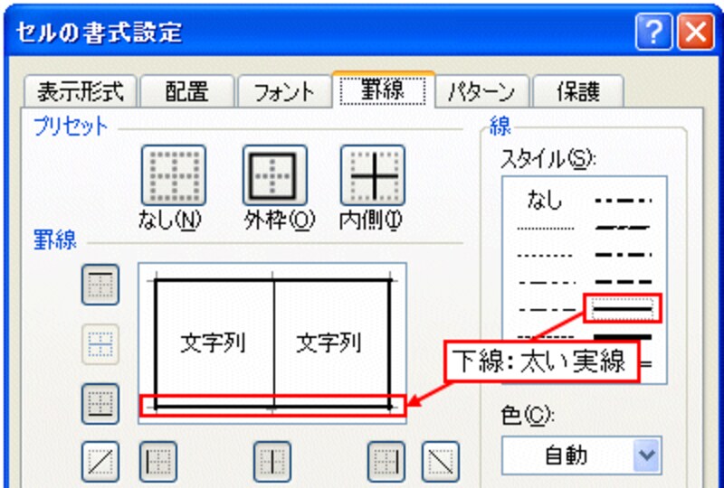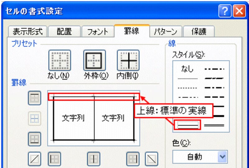 5.「セルの書式設定」ダイアログボックスの「罫線」タブをクリックして、罫線を次のように設定