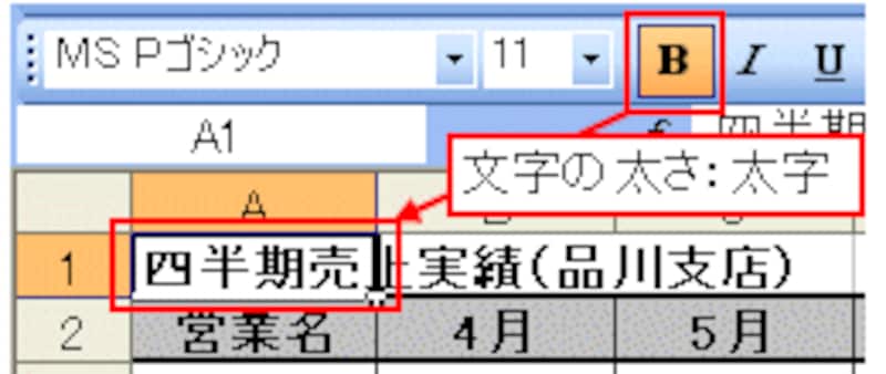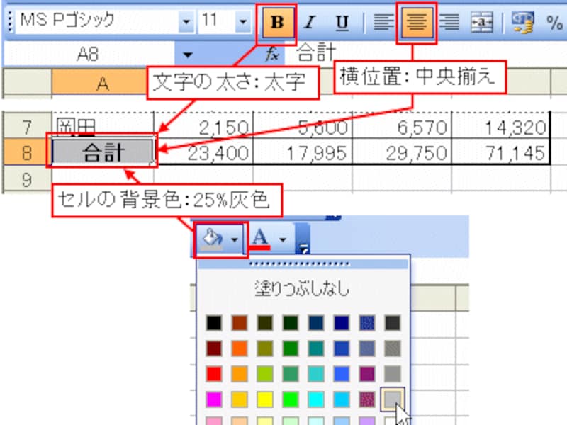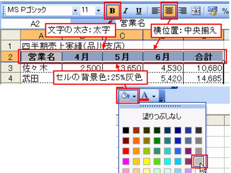 6.「太字」「中央揃え」に設定し、セルの背景色を「25% 灰色」に設定