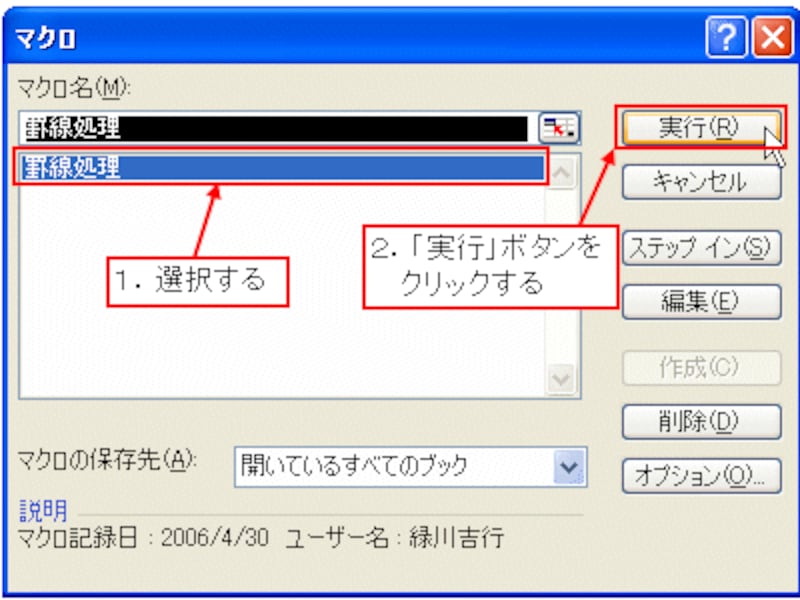 表示された「マクロ」ダイアログボックスの「マクロ名」の一覧に、先ほど作成したマクロ「罫線処理」が表示されています。これを選択して「実行」ボタンをクリックします。