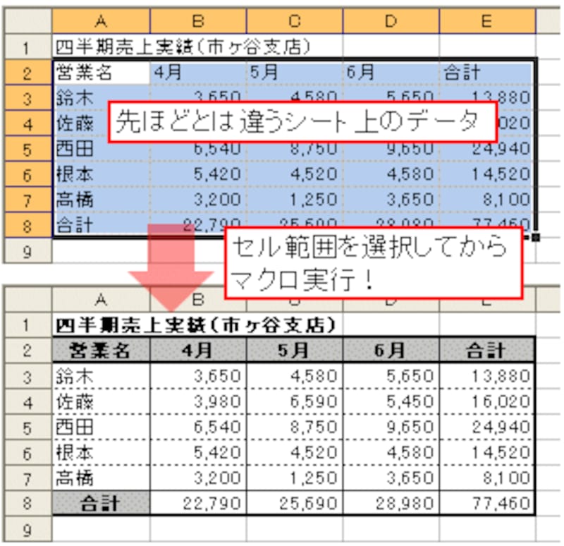 先ほど罫線を引いたセル以外の任意のセルを選択して(ここでは、別シートに入力した「市ヶ谷支店の売上実績表を選択しています)、「ツール」メニュー→「マクロ」→「マクロ」をクリックします。