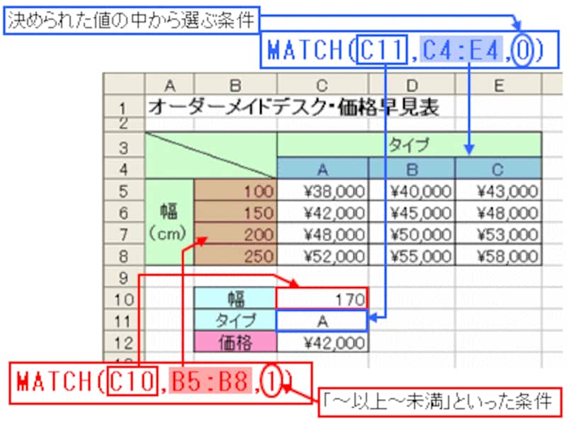 同様に、横の見出しから条件の位置を探す式は「MATCH(C11,C4:E4,0)」となります。検索方法は、決められた値の中から選ぶ形なので「0」を指定しています。