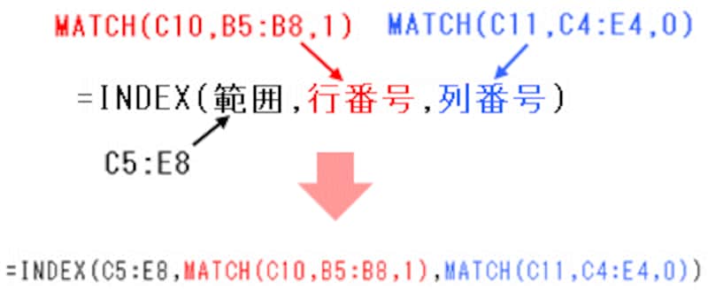 これらの式を、INDEX関数の「行番号」と「列番号」を指定する部分に組み合わせることで、早見表からデータを取り出す式「=INDEX(C5:E8,MATCH(C10,B5:B8,1),MATCH(C11,C4:E4,0))」が完成します。