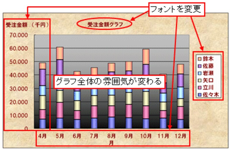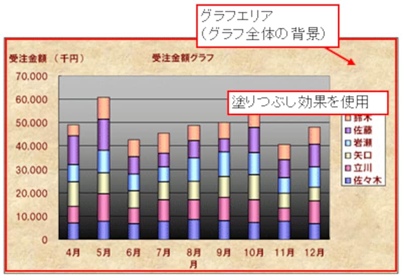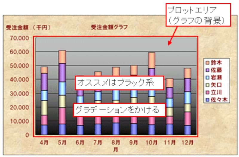 見た目に凝ったグラフを作成したい。そう考えたら、まず、グラフ内の3つの部品、プロットエリア、グラフエリア、各系列の書式変更を考えます。ここでは、これまで作成してきた受注合計額グラフを、見た目を良くするポイントを確認しながら、下図のような書式に変更してみます。