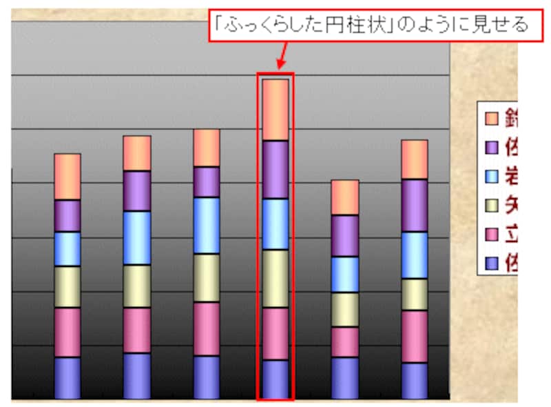 棒グラフの場合、グラデーションを上手に利用して、棒グラフを「ふっくらした円柱状」のように見せると、見栄えのするグラフになります。