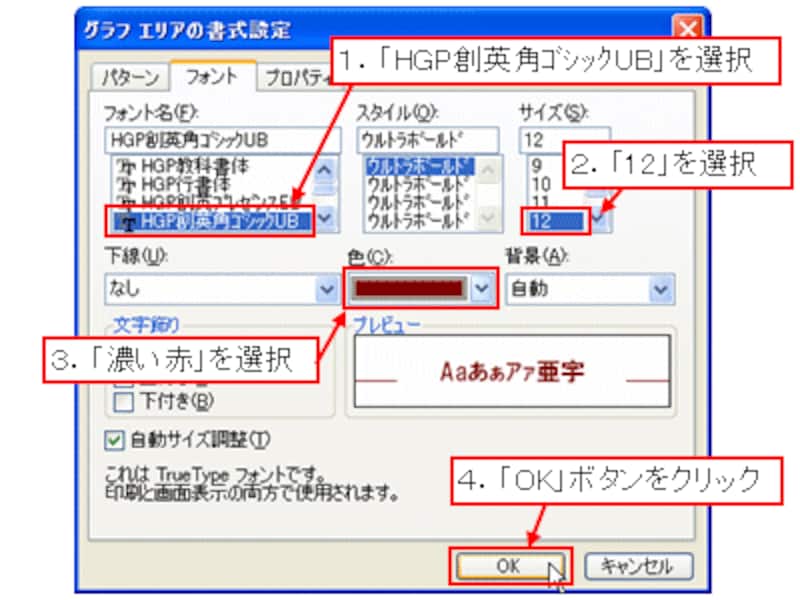 表示された「グラフエリアの書式設定」ダイアログボックスで「フォント」タブをクリックし、「フォント名」「サイズ」「色」を次のように設定して「OK」ボタンをクリックします。