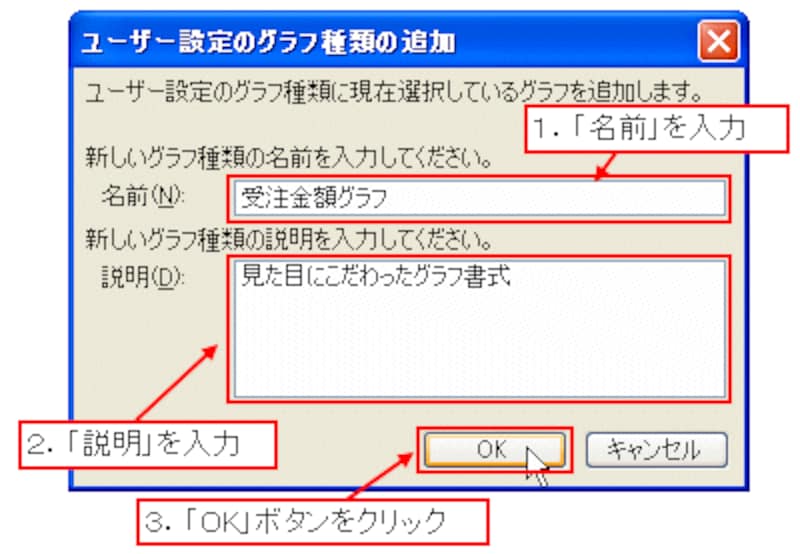 表示された「ユーザー設定のグラフの種類の追加」ダイアログボックスで、登録したいグラフの「名前」と「説明」を入力し、「OK」ボタンをクリックします。