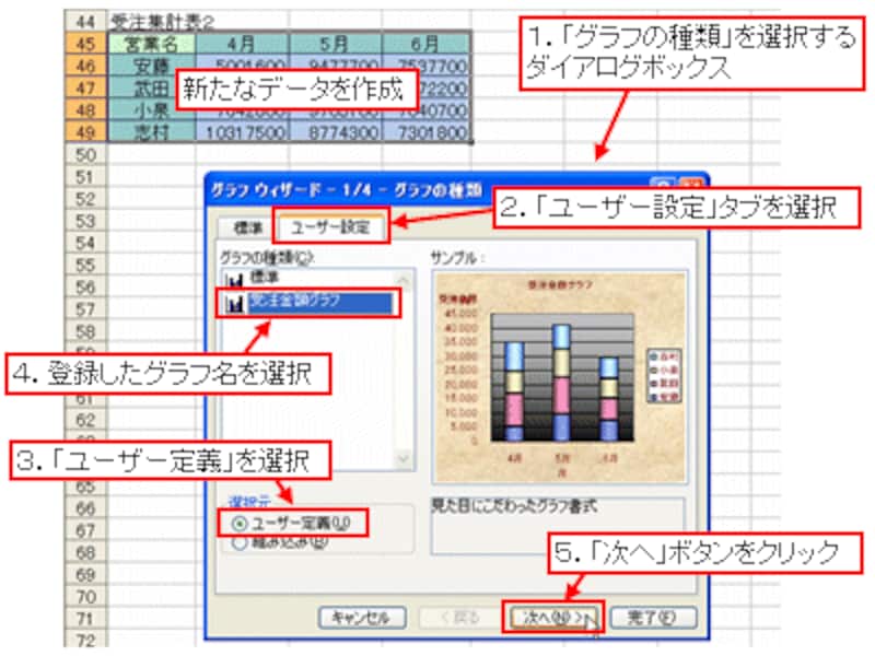 新たなデータでグラフを作成するときに登録したグラフの書式を利用する場合は、グラフウィザードの「グラフの種類」を選択するダイアログボックスで、「ユーザー設定」タブを選択します。「選択元」で「ユーザー定義」を選択すると「グラフの種類」一覧に登録したグラフ名が表示されるので、そのグラフ名を選択して、「次へ」ボタンをクリックします。