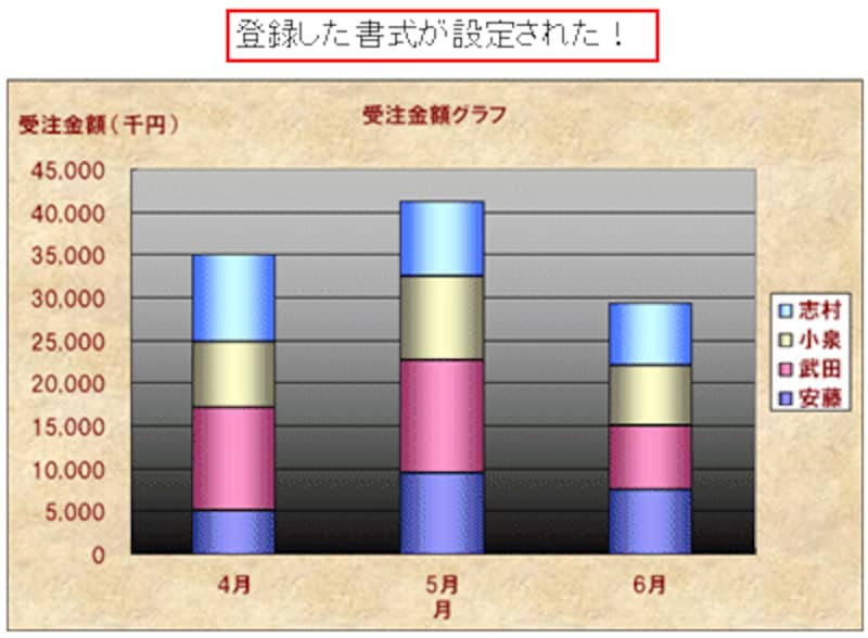 あとは、グラフウィザードの指示に従って操作を進めるだけで、新たに作成したグラフに、登録した書式を設定できました!