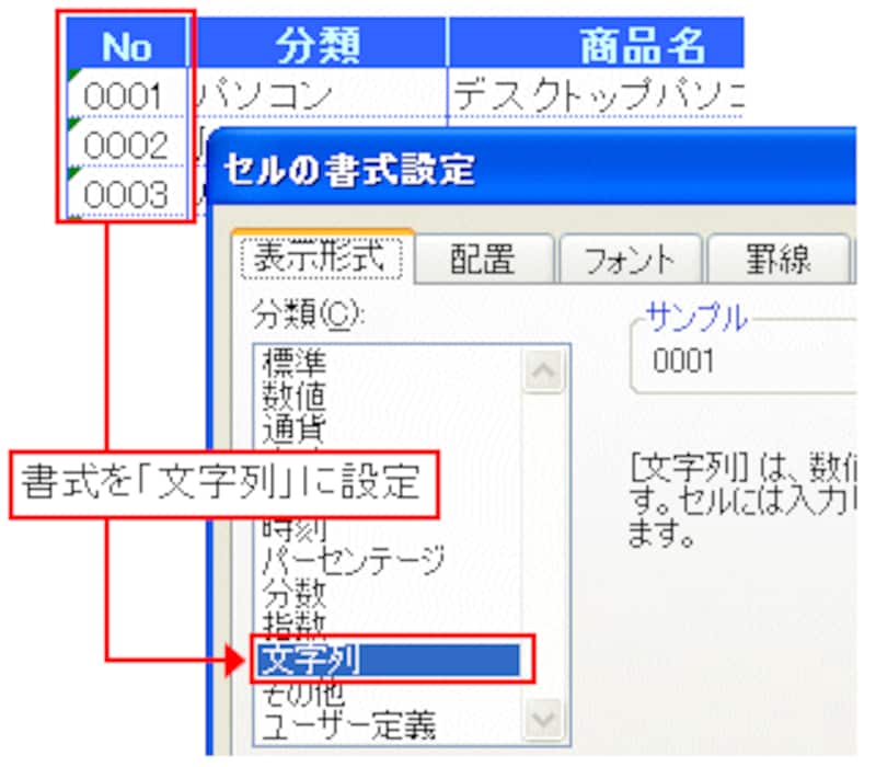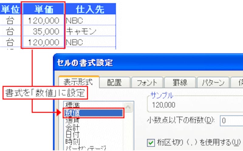 金額を算出するための単価などの項目は、迷わずセルの書式設定の表示形式で「数値」に設定しましょう。これに対し、コード番号などのような、数値というより「文字列」として扱うような数字は、セルの書式設定で「文字列」に設定した方が良いでしょう。数値のままだと、「00001」と入力しても「1」と自動変換されてしまいますが、この設定により「00001」と入力できます。